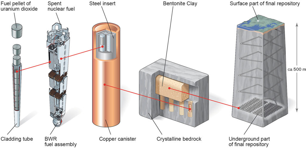 SKB uses a special method for final disposal of the spent nuclear fuel. It is called KBS-3 and is based on three protective barriers: copper canisters, Bentonite clay and the Swedish bedrock.