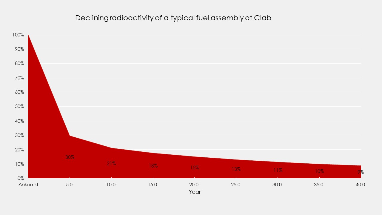 After 100,000 years, activity has fallen to a level equivalent to the amount of uranium ore originally mined to produce the fuel. At this point, radioactivity has decreased to a few thousandths of a percent compared with when the fuel was first received for interim storage at Clab.