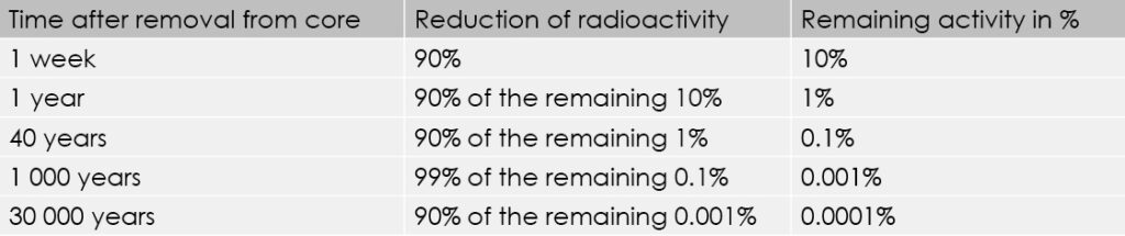 For radioactivity to decay by a further 90%, we will have to wait until about 30,000 years have passed. Activity is then at a few millionths of the level when the fuel was removed from the core.